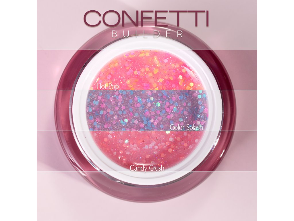 Découvrez le Confetti Builder Color Splash -NO HEMA, votre nouveau partenaire pour des ongles éblouissants et colorés, parfait pour l'été! Ce gel de construction unique est formulé avec de grandes et petites particules colorées qui capturent la lumière et donnent à vos ongles un éclat et une profondeur exceptionnels.