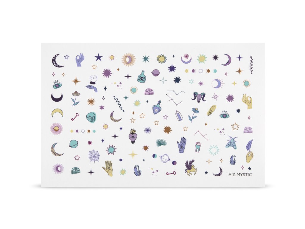 Chaque feuille mesure 9 x 14 cm et présente le motif captivant #11 MYSTIC, conçu pour ajouter une touche de mystère et de sophistication à vos ongles. Ces stickers sont non seulement magnifiques, mais également très pratiques, grâce à leur précision extrême qui facilite l'application.